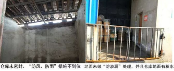 1.倉(cāng)庫(kù)“防風(fēng)、防雨、防曬、防滲、防腐”等措施是否完善;是否建設(shè)防泄漏收集裝置。