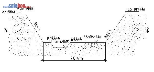 本工程采用85高程,坐標系統(tǒng)采用1980西安城市坐標系統(tǒng),±0.000相當于絕對標高為19.300 m。水泵房地下室面積367.84㎡,水泵房基坑處自然地面標高為19.000 m,基坑底標高為12.500 m(局部積水坑底標高為11.400 m),基坑底長26.4米(東西方向),基坑底寬17.4米(南北方向),基坑土方開挖量約4500立方米,根據本工程實際情況,我單位擬采用機械開挖土方,距設計底標高200~300mm時采用人工修挖。基坑東西剖面如下圖所示: