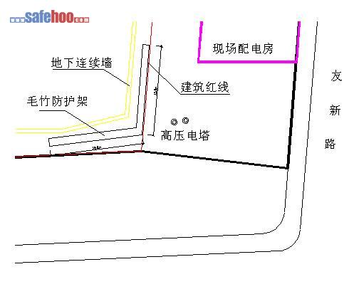 本工程?hào)|南角地下連續(xù)墻外側(cè)與110KV高壓電塔最近距離為5.3m。電塔地面以上第一道橫桿距地約7m。
