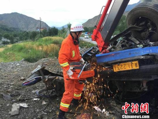 圖為消防救援人員正在拆解車體