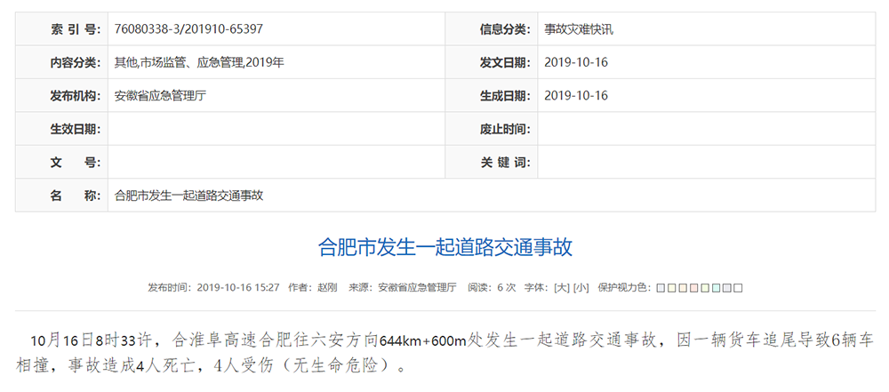 10月16日8時33許,合淮阜高速合肥往六安方向644km+600m處發(fā)生一起道路交通事故,因一輛貨車追尾導致6輛車相撞,事故造成4人死亡,4人受傷(無生命危險)。