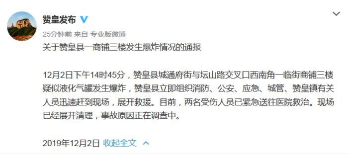 據河北省石家莊市贊皇縣人民政府官方微博2日通報,12月2日下午14時45分,河北贊皇縣城通府街與壇山路交叉口西南角一臨街商鋪三樓疑似液化氣罐發生爆炸。目前,兩名受傷人員已緊急送往醫院救治。現場已經展開清理,事故原因正在調查中。 ??