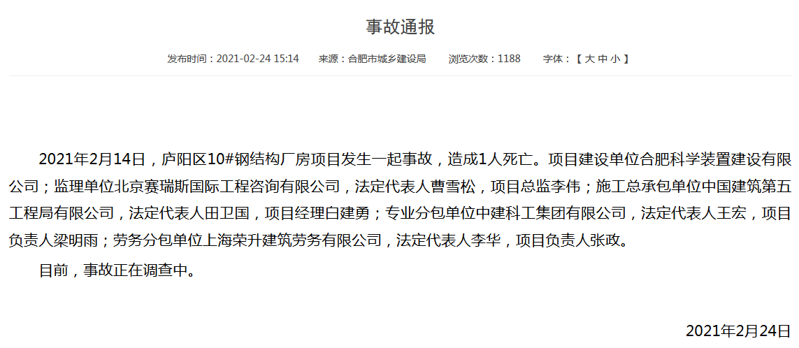 2021年2月14日,廬陽區(qū)10#鋼結(jié)構(gòu)廠房項目發(fā)生一起事故,造成1人死亡。項目建設(shè)單位合肥科學(xué)裝置建設(shè)有限公司;監(jiān)理單位北京賽瑞斯國際工程咨詢有限公司;施工總承包單位中國建筑第五工程局有限公司;專業(yè)分包單位中建科工集團有限公司;勞務(wù)分包單位上海榮升建筑勞務(wù)有限公司。