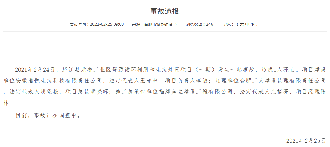 2021年2月24日,廬江縣龍橋工業(yè)區(qū)資源循環(huán)利用和生態(tài)處置項目(一期)發(fā)生一起事故,造成1人死亡。項目建設(shè)單位安徽浩悅生態(tài)科技有限責(zé)任公司;監(jiān)理單位合肥工大建設(shè)監(jiān)理有限責(zé)任公司;施工總承包單位福建昊立建設(shè)工程有限公司。