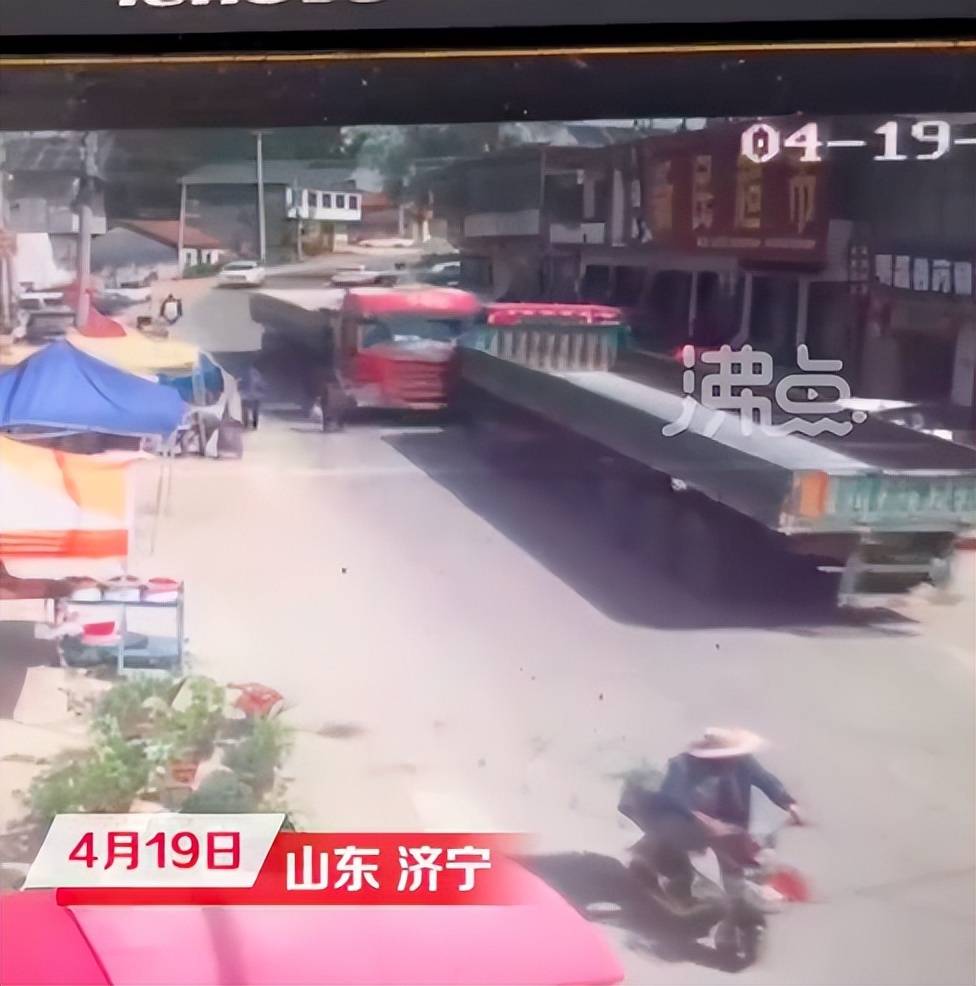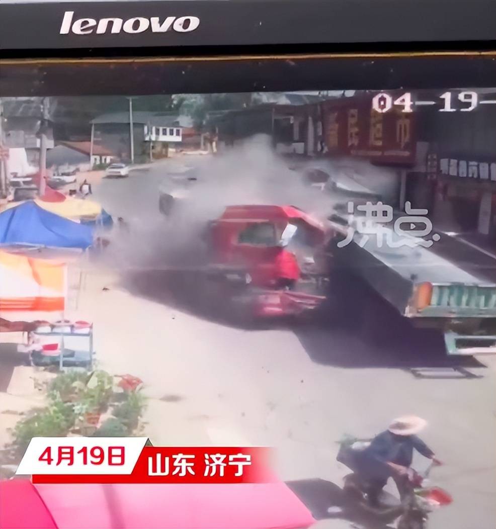 監控視頻顯示,碰撞發生時,有村民在路面走動,碰撞瞬間,在地面掀起巨大灰塵,紅色貨車車頭瞬間解體,疑似有路人被撞倒。