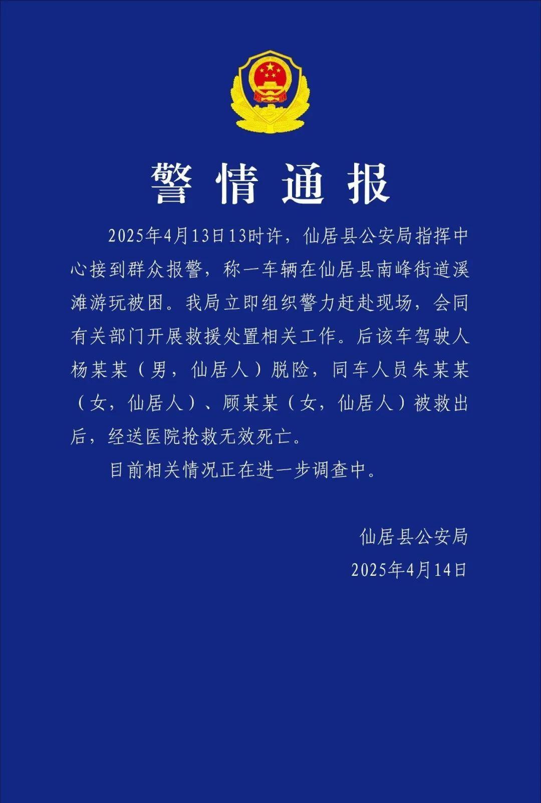 4月14日,仙居縣公安局發(fā)布警情通報(bào):2025年4月13日13時(shí)許,仙居縣公安局指揮中心接到群眾報(bào)警,稱一車輛在仙居縣南峰街道溪灘游玩被困。我局立即組織警力趕赴現(xiàn)場(chǎng),會(huì)同有關(guān)部門(mén)開(kāi)展救援處置相關(guān)工作。后該車駕駛?cè)藯钅衬?男,仙居人)脫險(xiǎn),同車人員朱某某(女,仙居人)、顧某某(女,仙居人)被救出后,經(jīng)送醫(yī)院搶救無(wú)效死亡。目前相關(guān)情況正在進(jìn)一步調(diào)查中。