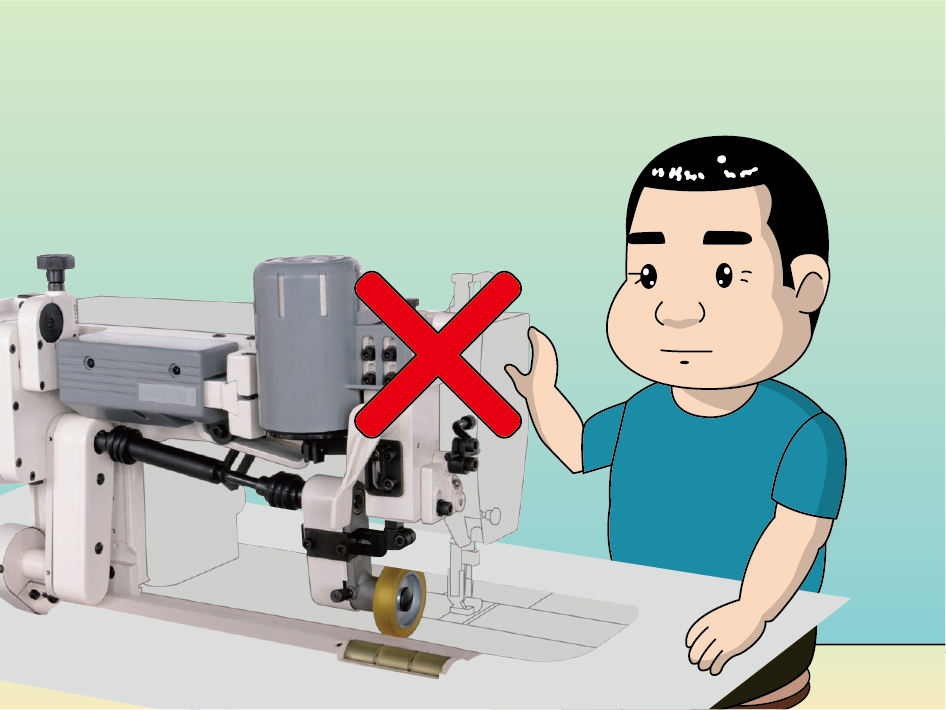 5.用手送料操作時,嚴(yán)禁將手指伸入護(hù)針架。手指、頭部(頭發(fā))和衣服應(yīng)遠(yuǎn)離上輪、皮帶和電機。而且,在上輪、皮帶和電機周圍不要放置任何物品。