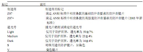 例如某制造商 K生產的滿足 ANSI Z87.1-2003 高強度防沖擊要求的防沖擊眼鏡,標記為:K Z87+,若鏡片同時具有 5 的遮光號,則標記為:K Z87+ 5。對可更換鏡片的防護眼鏡或眼罩,標記應標于鏡片上,對不可更換鏡片的防護眼鏡或眼罩,標記可標于鏡片或鏡架上,標記方式相同。?