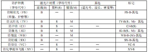 中規定了眼面護具的分類、結構、規格、材料、技術要求、試驗方法、檢驗規則、包裝和運輸。對于國產的眼護具規定了如下的標記方式: