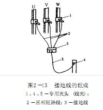 攜帶型接地線由專用夾頭和多股軟銅線組成,如圖2-13中1、4、5是專用夾頭(線夾),夾頭4將接地線與接地裝置連接,5將短路線與接地線連接起來,1把短路線設置在需要短路接地的電氣設備上,2、3均由多股軟銅線編成3根(三相)短的和一根(接地)長的軟銅線,其截面積不得小于25mm2,并應符合短路電流通過時不致因高熱而熔斷的要求,此外還需具有足夠的機械強度。