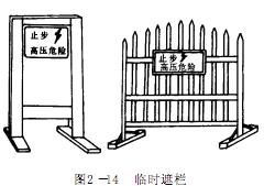 臨時遮欄如圖2-14所示,用干燥木材、橡膠或其他堅韌絕緣材料制作,但不準用金屬材料制作,高度不低于1.7m,并懸掛:“止步,高壓危險!”的標示牌。臨時遮欄是一種可移動的隔離防護用具,用以防護工作人員意外碰觸或過分接近帶電體,避免觸電事故。