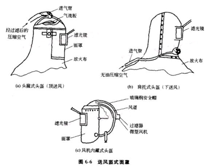 如圖6-6所示,送風(fēng)盔式面罩可分為:頂送風(fēng)式、下送風(fēng)式以及風(fēng)機(jī)內(nèi)藏式。必須注意,風(fēng)源應(yīng)是經(jīng)過凈化的新鮮空氣,不許用氧氣來代替,以免發(fā)生燃燒爆炸事故。