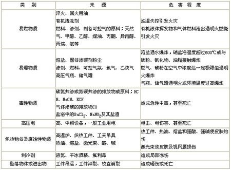 危險因素是指能對人造成傷亡或?qū)ξ镌斐赏话l(fā)性損壞的因素,熱處理生產(chǎn)中常見的化學(xué)性危險因素有易燃,易爆物質(zhì)和毒性物質(zhì),物理性危險因素有高壓電、熾熱物體及腐蝕介質(zhì)、制冷劑、墜落物體或進(jìn)出物,其來源和危害程度見表1.