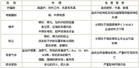 有害因素是指影響人的身心健康,導(dǎo)致疾病(含職業(yè)病)或?qū)ξ镌斐陕該p壞的因素。其與危險因素的主要區(qū)別在于損害形式不同,有害因素屬緩慢性的,而危險因素為突發(fā)性的。熱處理生產(chǎn)常見的有害因素有熱輻射、電磁輻射、噪聲、粉塵和有害氣體等,其來源和有害程度見表2.