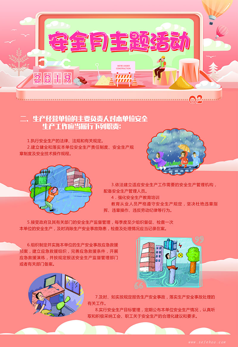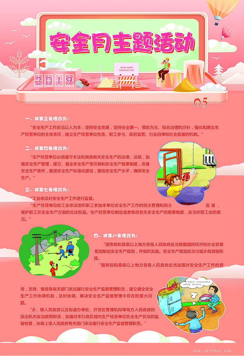 本套掛圖將2019 安全月主題凝結成精煉的語言,溫馨的畫面,主題突出、層層遞進,從而加深對安全發展的體會和理解。具有營造安全生產月氣氛、增強員工應急意識、促進安全生產的作用。(本招貼將根據具體的安全生產月主題進行一定的調整)