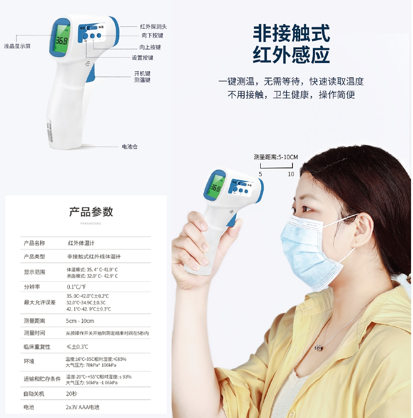 非接觸式高精度測量;1秒內能快速測出體溫;獨立測溫模式,一鍵切換,方便快捷;除測體溫,可測奶溫、洗澡水溫等。是家庭測溫常備用品。