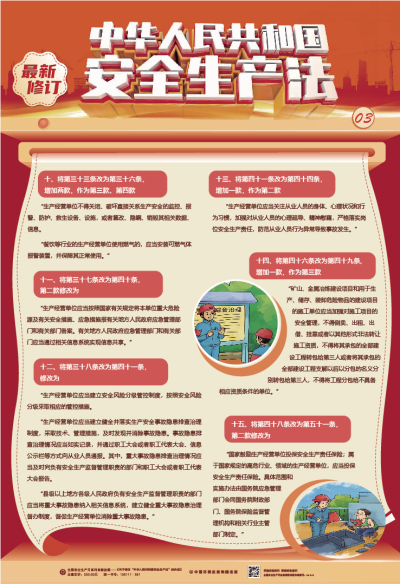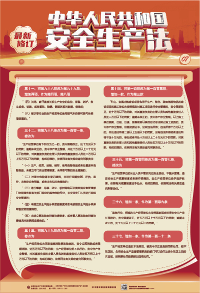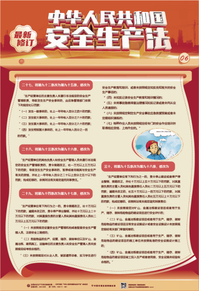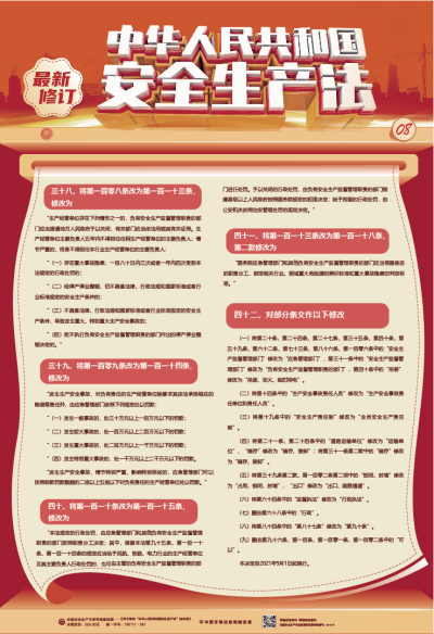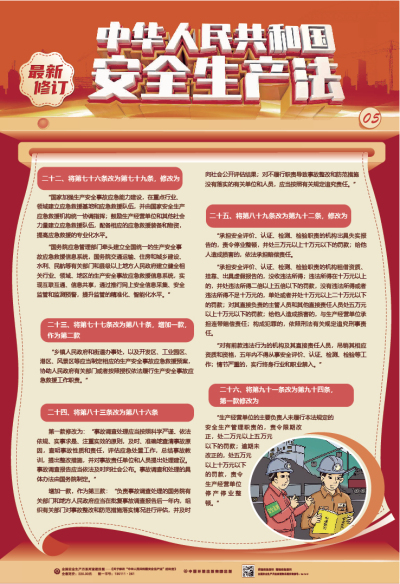 本掛圖為系列掛圖,主要介紹最新修訂的《安全生產法》的背景、必要性、主要修改內容等。掛圖圖文設計精美,對該法重要條款進行了歸納分類并配圖演示,通俗易懂,適合基層員工學習掌握,適合廣大生產經營單位進行普法宣傳。