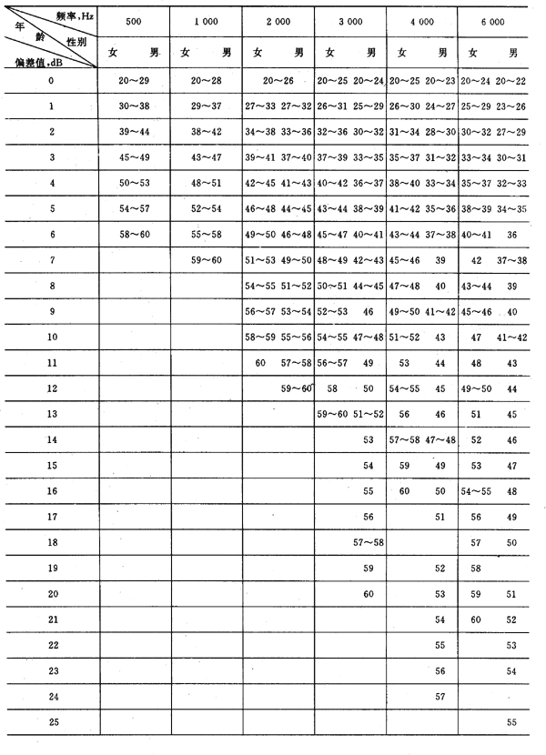 表B1中級出了頻率從500~6000Hz相對于年齡為18歲的聽閾級偏差的中值(修約至最接近的整分貝數),該值為年齡從20歲到60歲男性和女性耳科正常組50%的期望統計分布。