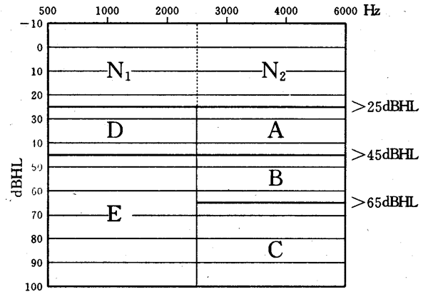 A1 使用聽力損失分級圖表時,語頻(500,1000,2000Hz)和高頻(3000,4000,6000Hz)是指一耳任一頻率聽力損失達到的范圍,非指一組頻率的平均值。以“+”示語頻和高頻的組合。