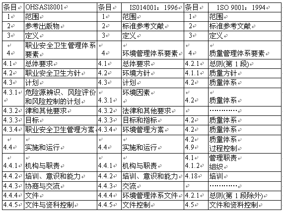 OHSAS l8001與ISO 9001:1994和ISO 14001:1996標準之間的相關性