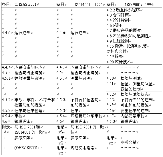 無論管理的活動是質量、環境、職業安全衛生還是其他的組織活動,管理體系的基本原理是共同的。一些組織可能在擁有一個完整的管理體系方面見到了效益,而其他的組織則可能更愿意在相同管理體系的基礎上采納不同的體系。表A.1對那些執行這類國際標準和希望將職業安全衛生結合到其管理體系中的人們展示了OHSAS l8001與BS EN ISO9001和BS EN ISO 14001標準之間的相關性,這種相關性僅在指南中顯示。