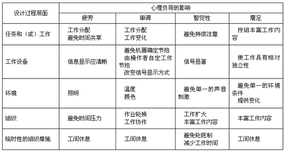 在系統(tǒng)設計中應當注意,一項工作是由多項任務組成的,而執(zhí)行每項任務都需要一定的技術(shù)設備、工作環(huán)境和組織機構(gòu),這些都提供了影響與心理負荷相關(guān)的工作系統(tǒng)設計的機會。