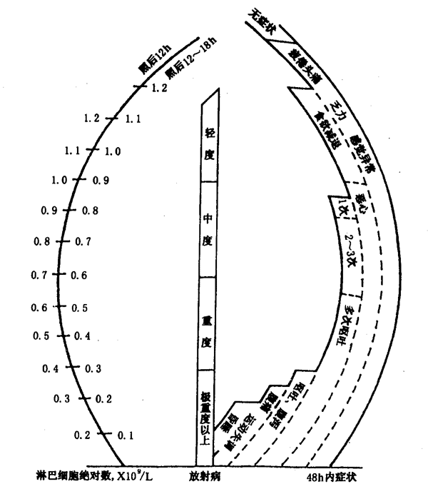 注:按照后12h或24~48h內淋巴細胞絕對值和該時間內病人出現過的最重癥狀(圖右柱內側 實線下角)作一聯線通過中央柱,柱內所標志的程度就是病人可能的診斷;如在照后6h對病人進行診斷時,則僅根據病人出現過的最重癥狀(圖右柱內側實線的上緣)作一水平橫線至中央柱,依柱內所標志的程度加以判斷,但其誤差較照后24~48h判斷時大。第一次淋巴細胞檢查最好在使用腎上腺皮質激素或抗輻射藥物前進行。
