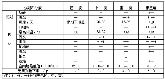 5.3.2輕度腸型急性放射?。菏苷談┝?0~20 Gy。除照后1h內出現嚴重惡心、嘔吐外,1~3天內出現腹瀉稀便,血水便,并可有腮腺腫痛,經3~6天緩解期后上述癥狀加重為極期開始,可伴有水樣便或血水便,發熱。