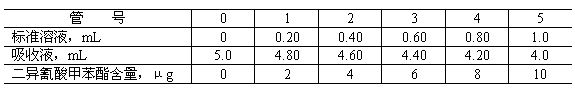 A3.5 標準溶液:于25mL量瓶中加入5mL二甲基甲酰胺,準確稱重,加入1~2滴二異氰酸甲苯酯,再準確稱重,兩次重量之差即為二異氰酸甲苯酯的重量,然后用二甲基甲酰胺,稀釋到刻度。計算每毫升溶液中二異氰酸甲苯酯的含量,再用二甲基酰胺稀釋成1mL含100μg二異氰酸甲苯酯的溶液,取5.0mL上述溶液于50mL量瓶中,加7.50mL二甲基甲酰胺及1.25mL鹽酸,混勻后用水稀釋至刻度,配成1mL=10μg二異氰酸甲苯酯的標準溶液。