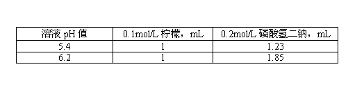 A3.14 緩沖溶液,用檸檬酸溶液和磷酸氫二鈉溶液,按比例配制pH=5.4和pH=6.2的緩沖溶液,見(jiàn)表A1: