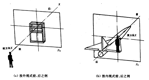 為了明確方向,以對象物的三軸線為基礎確定觀察者的視點及視方向。分為外視觀察方式(簡稱外視式)及內視觀察方式(簡稱內視式)。