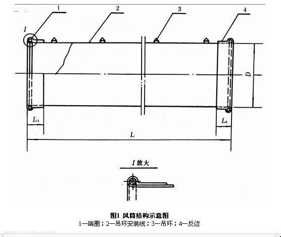 4.5.1 在風筒吊環安裝線上從距端圈200 mm處起,以等距離安裝吊環,兩吊環間距應不大于800mm。吊環安裝要牢固,安裝處不得漏風。