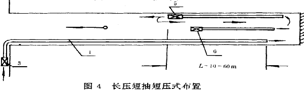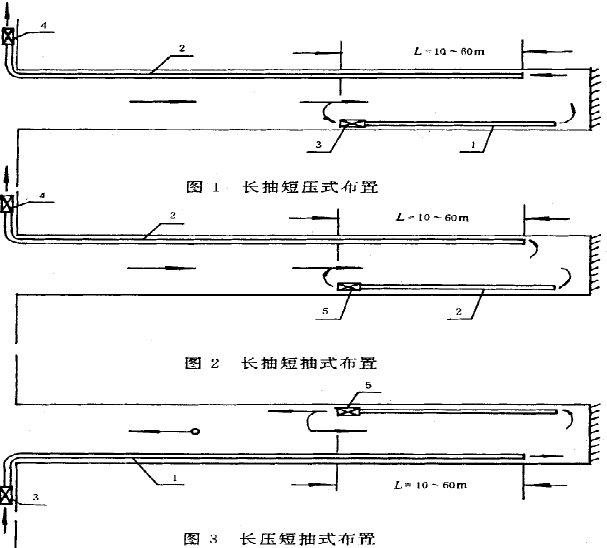 c.“長壓、短抽”方式 主導(dǎo)局部通風(fēng)機(jī)及主導(dǎo)風(fēng)筒作壓入式通風(fēng),位于掘進(jìn)巷道中的局部通風(fēng)機(jī)(或濕式除塵通風(fēng)機(jī)或水射流通風(fēng)機(jī))和風(fēng)筒作抽出式通風(fēng)的方式,見圖3。