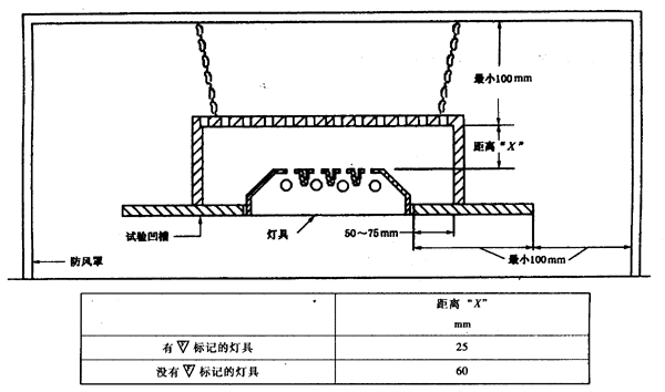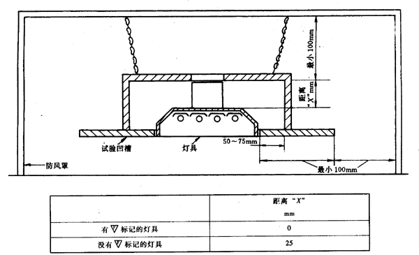 對有空氣流動孔的通風式燈具進行試驗時,4.5mm厚的硬質纖維板頂蓋與試驗箱的各個側面可靠的密封起來,整個頂蓋平面上設有中心距25mm,孔徑4.5mm的多個小孔。