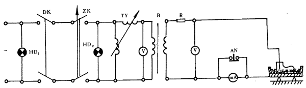 2—指示燈;DK—刀開關;ZK—自動開關;TY—感應調壓器或自耦變壓器;B—試驗變壓器;R—保護電阻;V—電壓表及靜電電壓表;mA—毫安表;AN—按鈕