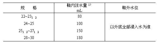 5.1.1 低壓絕緣膠鞋試樣內注水量及鞋外水位符合表1規定。