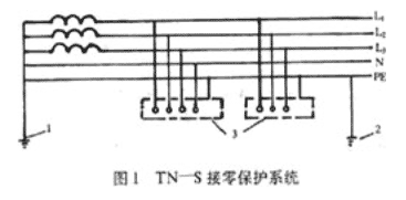 1-工作接地;2-重復(fù)接地;3-電氣設(shè)備外漏導(dǎo)電部分;L1,L2,L3-相線;N—工作零線;PE-保護(hù)零線