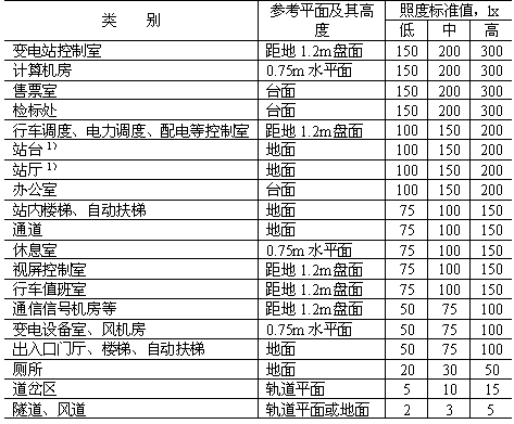 地下鐵道正常照明的照度標(biāo)準(zhǔn)值應(yīng)符合表2的規(guī)定。
