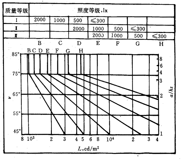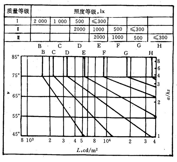 B6 根據(jù)燈具的類型,將燈具的亮度分布曲線置于圖B1或圖B2內(nèi)。根據(jù)眩光限制質(zhì)量等級以及該場所的照度等級選擇圖表中某條限制曲線進行比較,若燈具的亮度分布曲線全部落在限制曲線左邊,即符合眩光限制的要求;若落在限制曲線的右邊,則不符合眩光限制的要求;若燈具的亮度分布曲線一部分落在限制曲線的左邊,另一部分落在右邊(即兩條曲線相交),則該燈具的亮度在某些角度內(nèi)符合要求,其他角度上不符合要求,這時應(yīng)該確保主要視線方向上的燈具亮度值小于限制曲線上的亮度值。