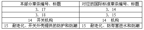 1.考慮到本部分是與GB16915.1-2003配合使用的,各章的標題與開關的通用要求盡可能一致。因此將14章的標題“機構”改為“開關機構”;15章的標題“耐老化、防有害進水和防潮”改為“耐老化、開關外殼提供的防護和防潮”。