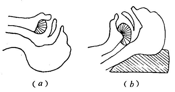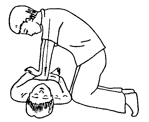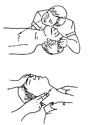 3.3.2 疑有頸椎損傷,在使傷員平臥后,用沙土袋(或其它代替物)放置頭部兩側(圖12)使頸部固定不動。必須進行口對口呼吸時,只能采用抬頦使氣道通暢,不能再將頭部后仰移動或轉動頭部,以免引起截癱或死亡。