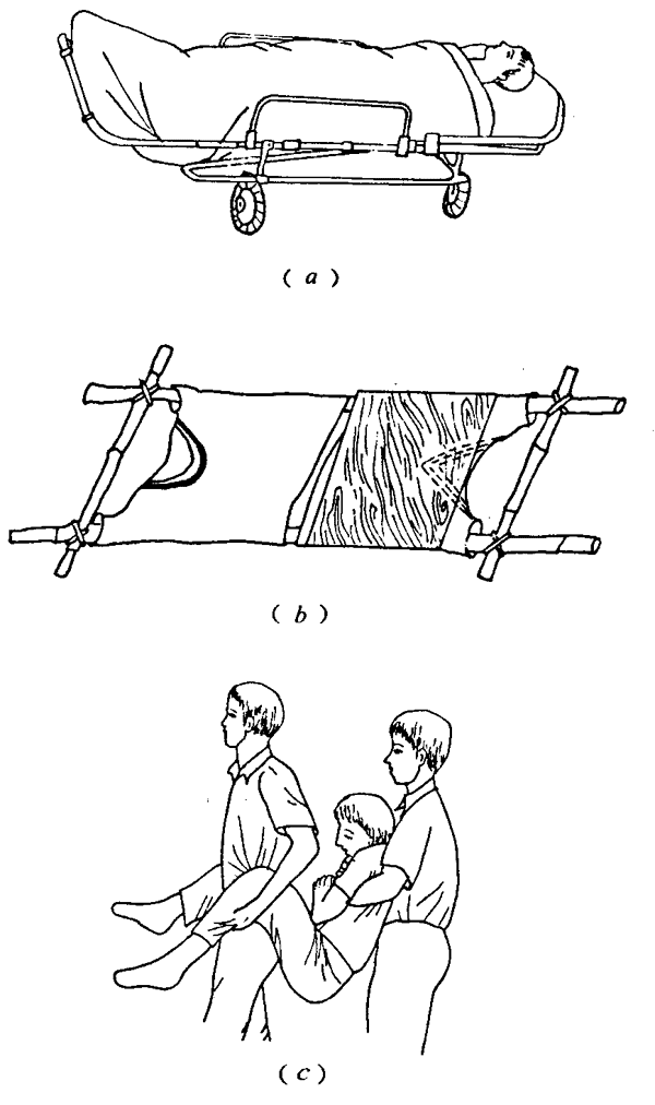 (a)正常擔架;(b)臨時擔架及木板;(c)錯誤搬運