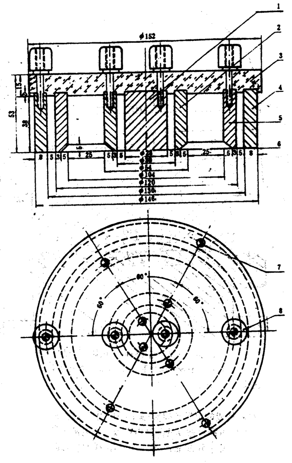1―中心圓柱形電極;2,4,5―環形電極;3―有機玻璃絕緣板;6―與試樣接觸的水平表面;7―定位螺絲;8―接線柱