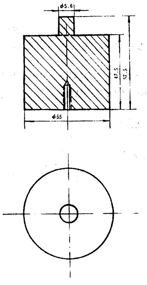 c. 一個圓柱形四端環形電極,其四個圓環用厚度為15mm的有機玻璃圓盤裝配在一起,底面加工成同一水平面,并鍍以5μm厚的黃金。電極總柱高為53mm,有效測試面是一個內圓直徑為44mm、外圓直徑為114mm、寬為35mm的環形面。電極材料黃銅,自重2.8kg,附加重量20kg(電級尺寸詳見圖2a,電極附加重塊尺寸見圖2b)。