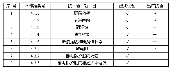 提供型式試驗的產(chǎn)品,必須在同一批次中隨機抽取三套靜電防護服,按表1中的項目進行試驗。