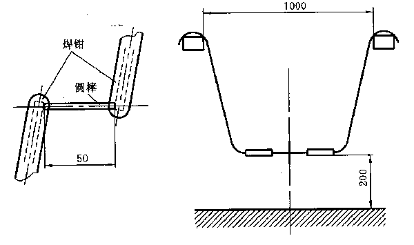 通過圓棒連在一起的焊鉗由其焊接電纜水平地懸掛在兩個相距1m的木架之間。被夾緊的圓棒處于兩木架之間,離地面200mm。試驗場所應(yīng)無空氣流動。