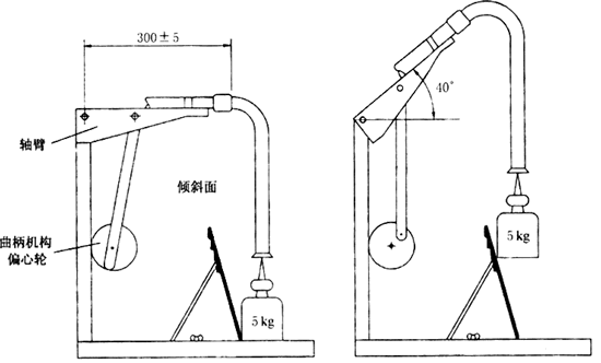 將打算連接到動力清潔頭的軟管末端固定在圖102所示試驗設備的樞臂上。樞臂軸和軟管伸進剛性部件處之間的距離為(300±50)mm。樞臂能從水平位置升起40°±1°。將一質量為5kg的重物掛在軟管的另一端,或者沿著軟管的方便之處。使得樞臂處于水平位置時,重物被支撐并不使軟管拉伸。