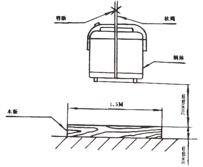在表面平整的混凝土地面上,水平放置大小約1.5m×1.5m,厚度為30mm的干松木板,對準木板中央部分,使鍋底面與板面平行,將鍋體從700mm高處剪斷所系繩子跌落一次。
