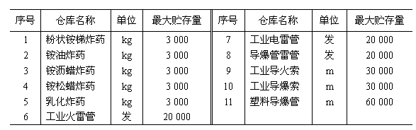 4.2.1 爆破器材倉庫的最大貯存量應(yīng)不超過一個(gè)月的使用量,并應(yīng)不大于表2的規(guī)定。