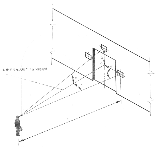 6.7標志的偏移距離X應盡量縮小。對于最大觀察距離D的觀察者,偏移角θ一般不宜大于5°,最大不應大于15°。如果受條件限制,無法滿足該要求,應適當加大標志的尺寸以滿足醒目度的要求。